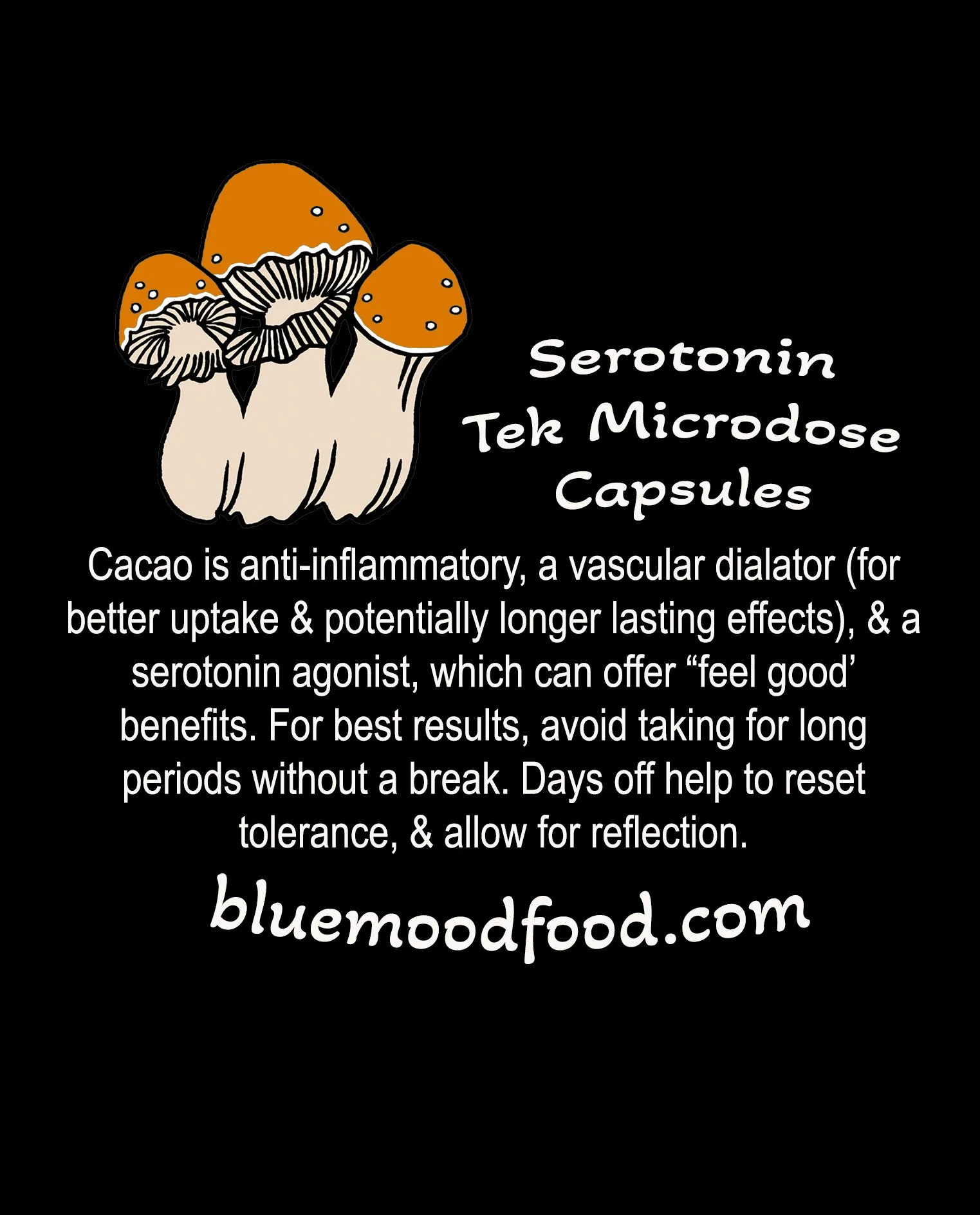 These vegan gelcaps pair organic, whole bean cacao with beneficial mushrooms. Cacao is anti-inflammatory, full of antioxidants, and dilates blood vessels, allowing for potentially longer lasting and more noticeable effects. Beneficial mushrooms and cacao are serotonin-agonists, enhancing “feel good” effects.